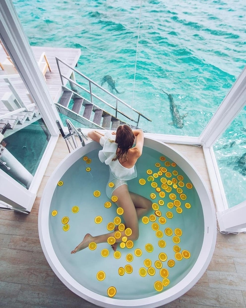 1 - Overwater retreat, a penthouse-style villa on stilts 2 - Beach retreat, a villa with a private beach 3 - Luxurious bath in your villa 4 - A dip into the cool Maldivian waters 5 - A tour of the whole resort